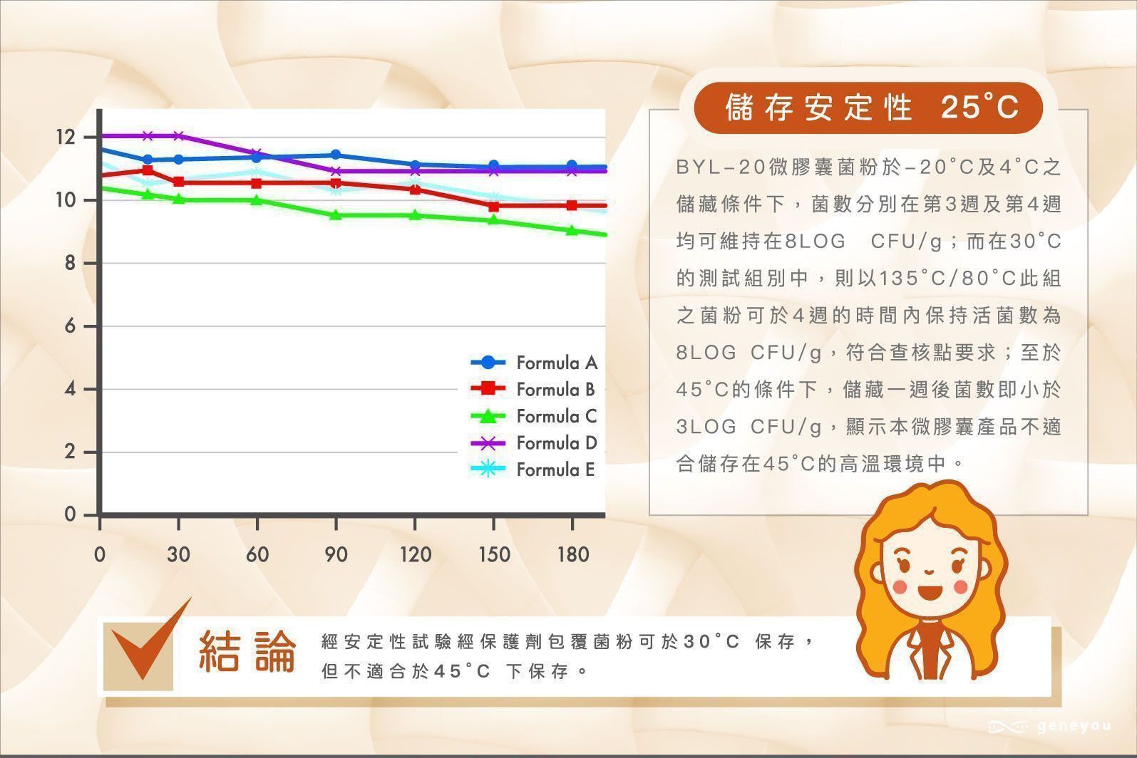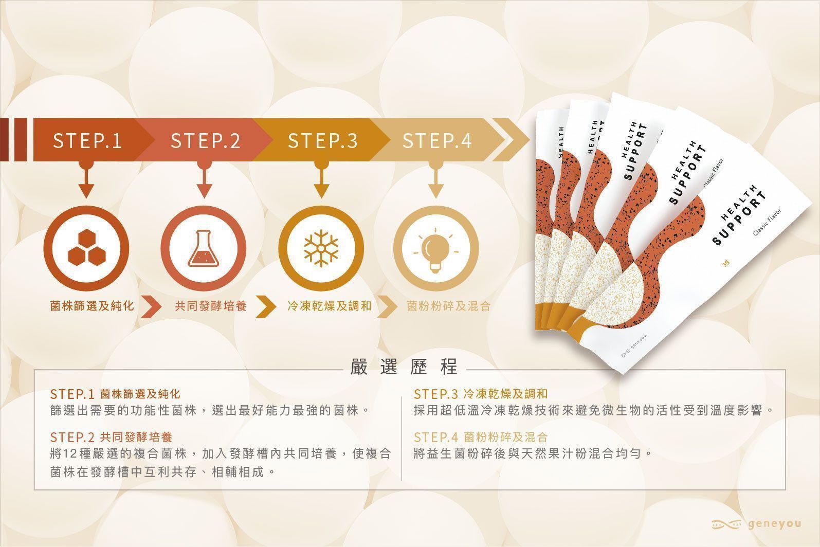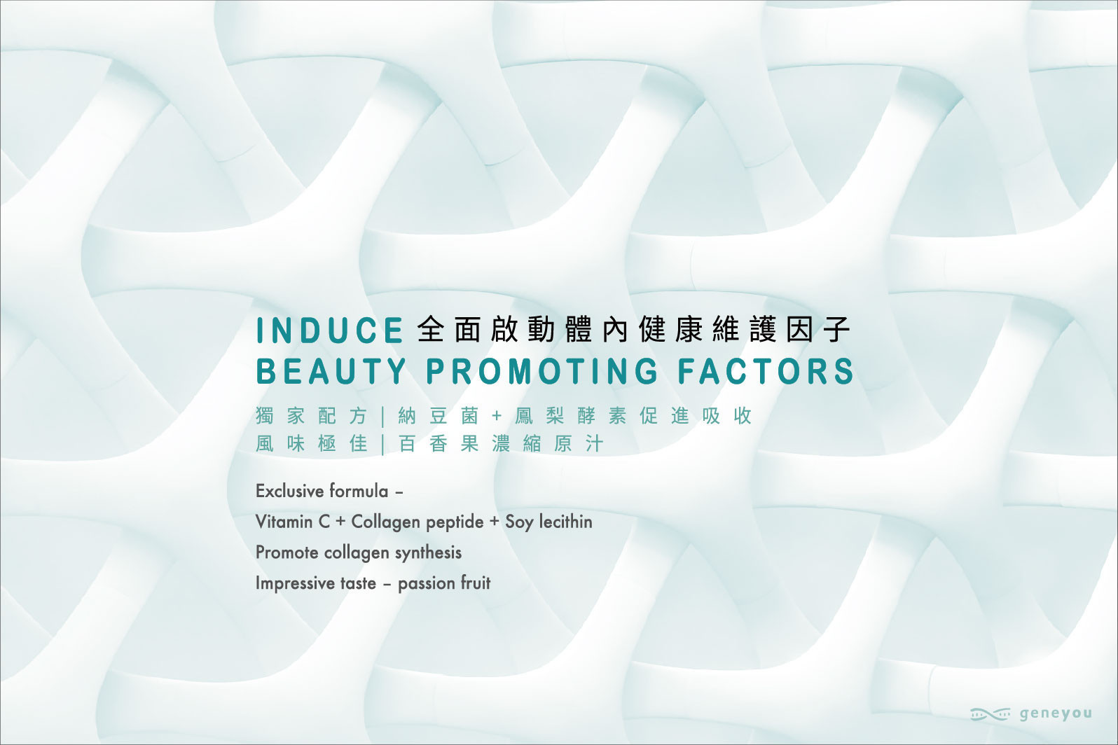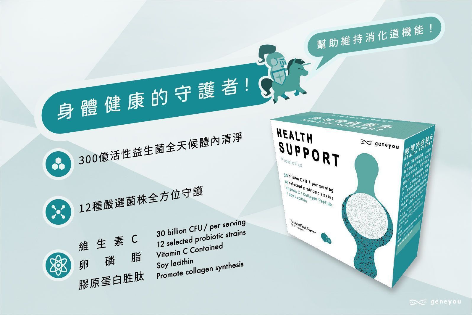 成份:即溶百香果果汁粉 (砂糖、麥芽糊精、百香果濃縮汁)、綜合乳酸菌 [嗜酸乳桿菌、保加利亞乳桿菌、副乾酪乳桿菌、植物乳桿菌、洛德乳桿菌、鼠李糖乳桿菌、比菲德氏菌、短雙歧桿菌、比菲德氏-龍根菌、嗜熱鏈球菌](阿拉伯膠、麥芽糊精、脫脂奶粉、葡萄糖、鳳梨萃取物)、大豆卵磷脂、膠原蛋白胜肽、水溶性纖維、菊苣纖維、後生元(副乾酪乳桿菌發酵粉)、納豆菌、二氧化矽